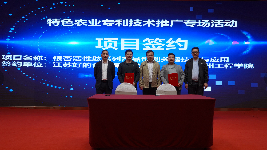 活動(dòng)現場(chǎng),江蘇好的食品有限公司、徐州維昌生物科技有限公司分別與徐州工程學(xué)院就“一種銀蒡多肽飲料的制備方法”、“復合黑蒜口服液關(guān)鍵技術(shù)與產(chǎn)品開(kāi)發(fā)計劃項目”等兩項專(zhuān)利成果進(jìn)行了現場(chǎng)簽約。